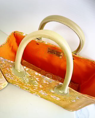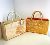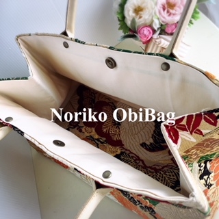 NorikoObiBagキットは柄目を生かしカットされた帯、底鋲付バッグ底、正絹ポケット付き内側、マグネットホック、本革持ち手など基本的な材料費を含みます。